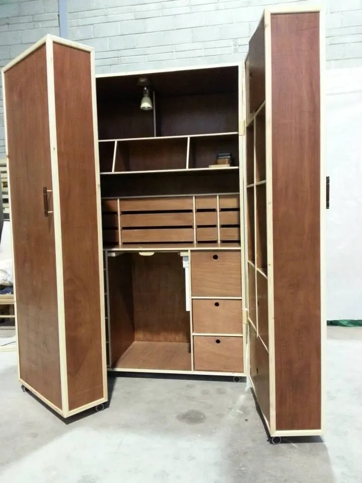 Basic Idea was to have a separate room for fly tying even if there isn't a separate room available in the house. The dimensions are width 110cm, depth 70cm and high 175cm ... with doors fully open it has a width of 220cm. I designed this one while I was building it ... so it took me a couple of weeks ... I guess I could make a copy of it working 70 hours (most time is down to sanding ... again and again)