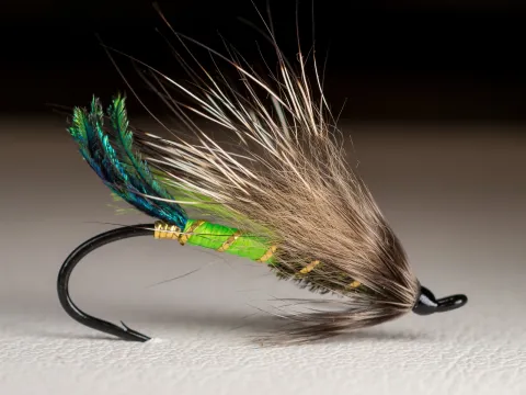Body Rear Half Fluorescent Green Floss, Veiled by same extending to mid tail, Front Half Peacock Herl