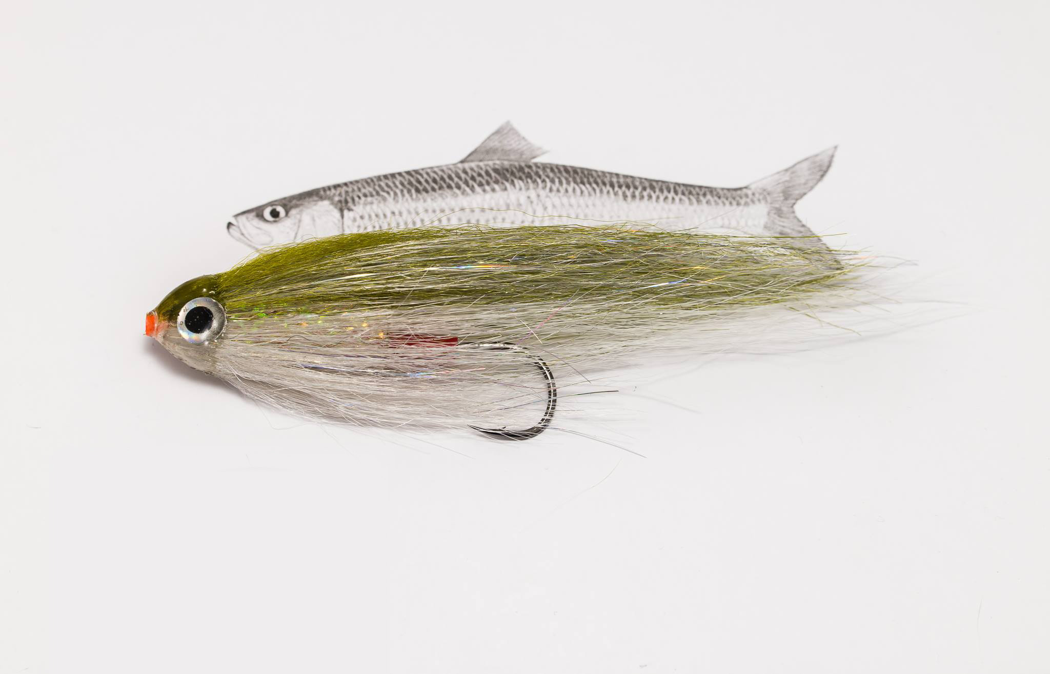 Main body, bottom Gray and olive CSF synthetic bucktail, silver Gliss'n'Glint and silver SW Angel Hair