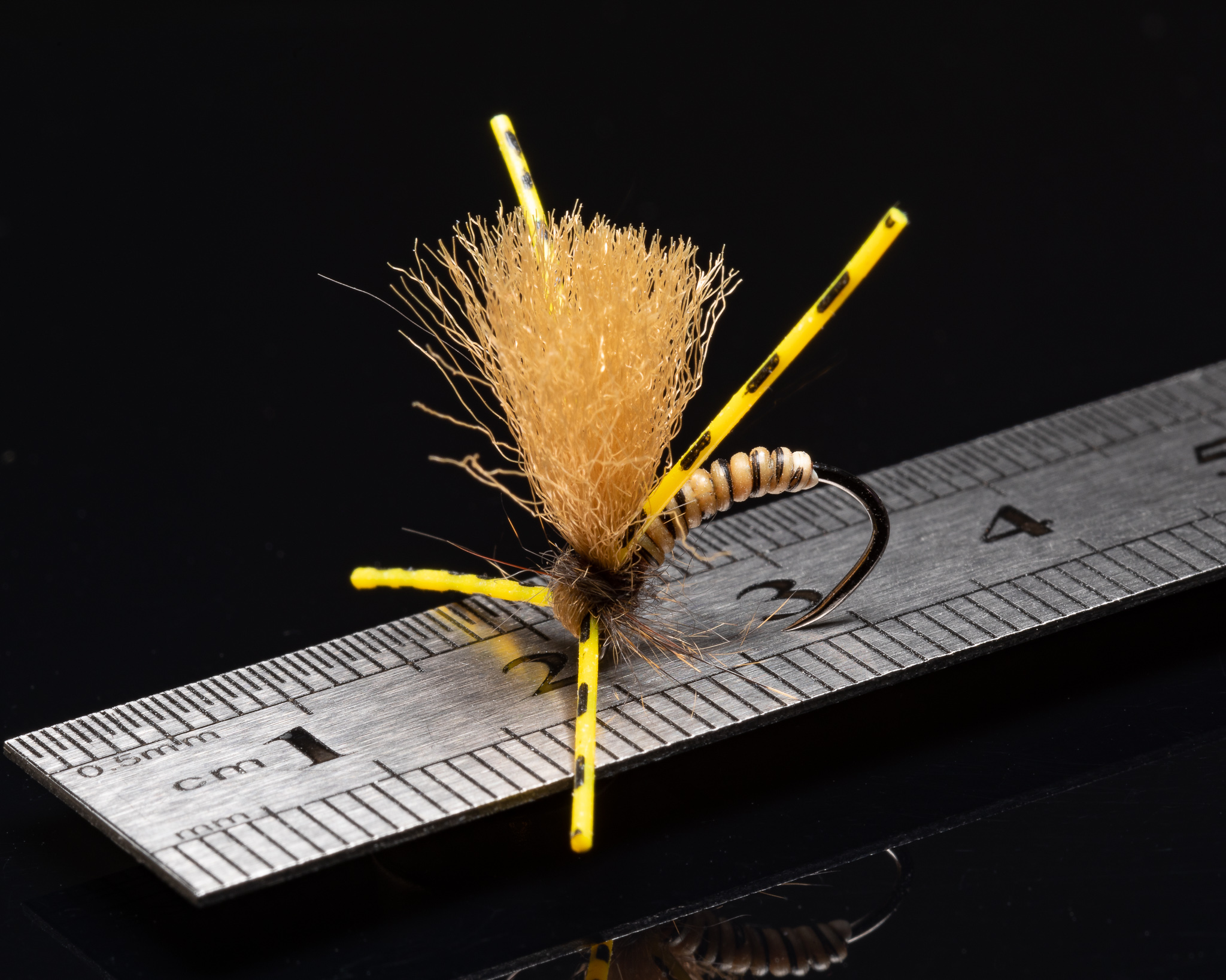 4. Tie in a yellow leg strand on either side of the hook a little way back from the eye.
