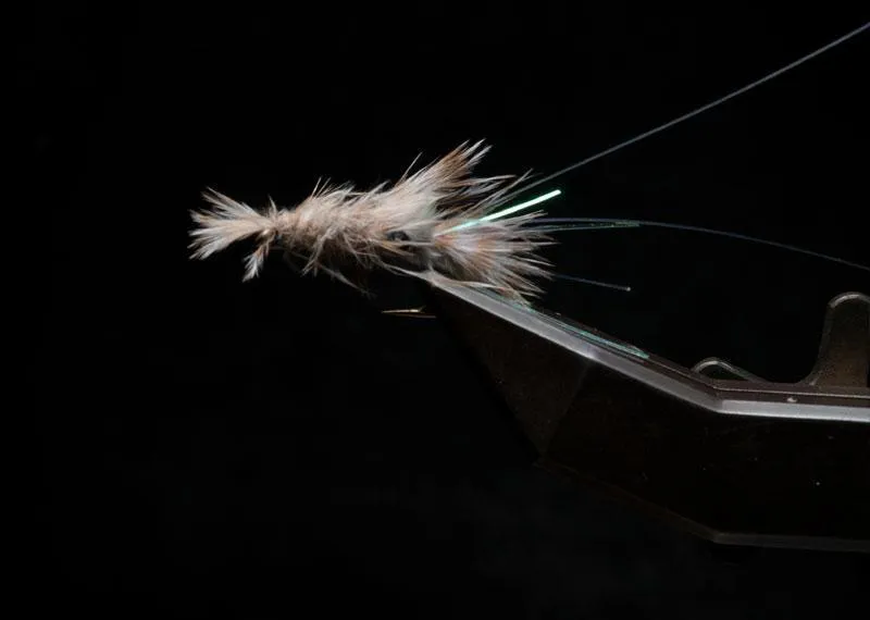 Cut the thread and varnish over the wraps. You can press down the wildest fibers on the back of the shrimp and varnish them to form a shield - or you can leave it be