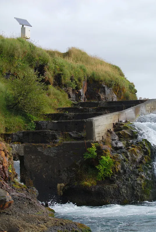 This ladder on the Ytri Rangá has several hundred salmon passing every 24 hours in the high season. Notice the solar cell powered counter on the top of the hill.