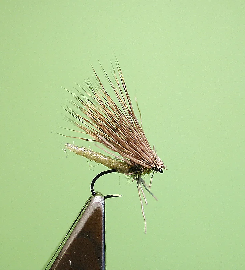 A caddis tied with a tube body and deer hair.