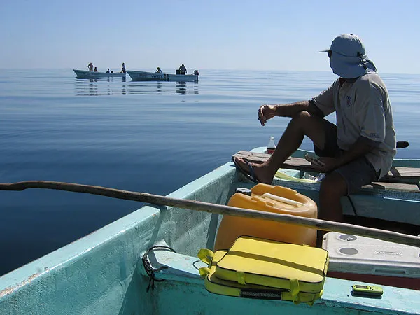 Although we are miles offshore there is no wind at all and the heat is doing its best to kill us.
