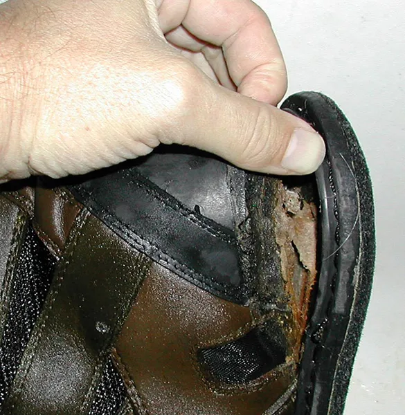 These Chota boots are dead! As you can see the upper material has given in in the rim along the sole and the boot is slowly "dissolving". As you can also see it is not only the outer layer that rips. The materials in the inner boot are also on the verge of total disintegration.