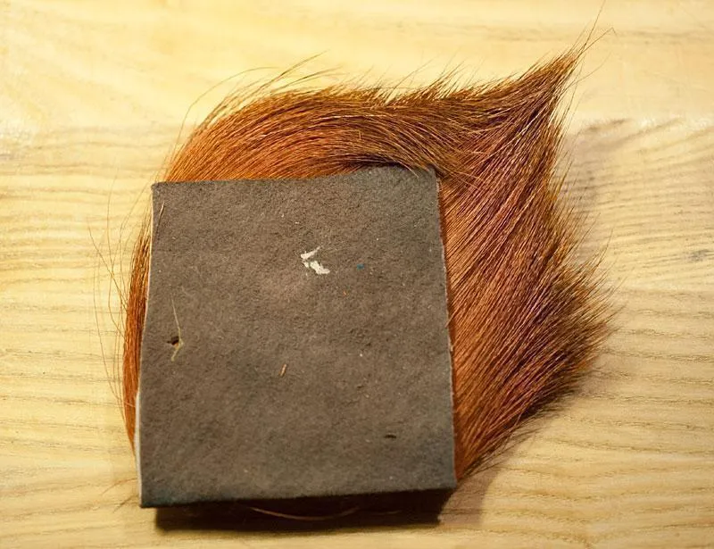 A small patch of dyed deer hair that has just been unpacked from a bag. Notice the curved hairs