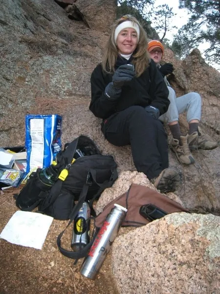 My wife, Kerry and step-son Kollin enjoy some hot cocoa as the sun sets over the canyon walls, making the air chilly and the water dark.