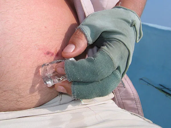 Putting ice from the ice box on a hook set in a person can be a very good idea. It keeps the wound from swelling and facilitates the later removal of that nasty iron.