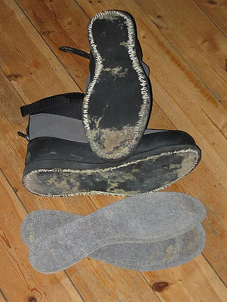 Vision has done a very bad job of copying these Teeny wading boots. The soles are stitched on and within a season I wore through the stitches. To make it even worse, the soles were hardly glued at all, and as soon as the stitches gave in, the soles started coming off. Notice how clean the felt soles are. As I have written elsewhere, the soles must be drenched in glue in order to hold. These barely ever touched glue.