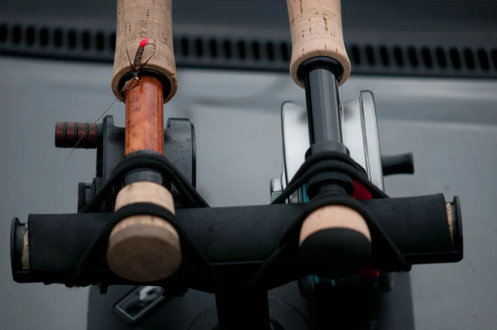 The two possible setups: a rod for a right handed on the left and for a left handed on the right. Some right hand casters actually have the handle on the right side, and switch hands when retrieving and fighting