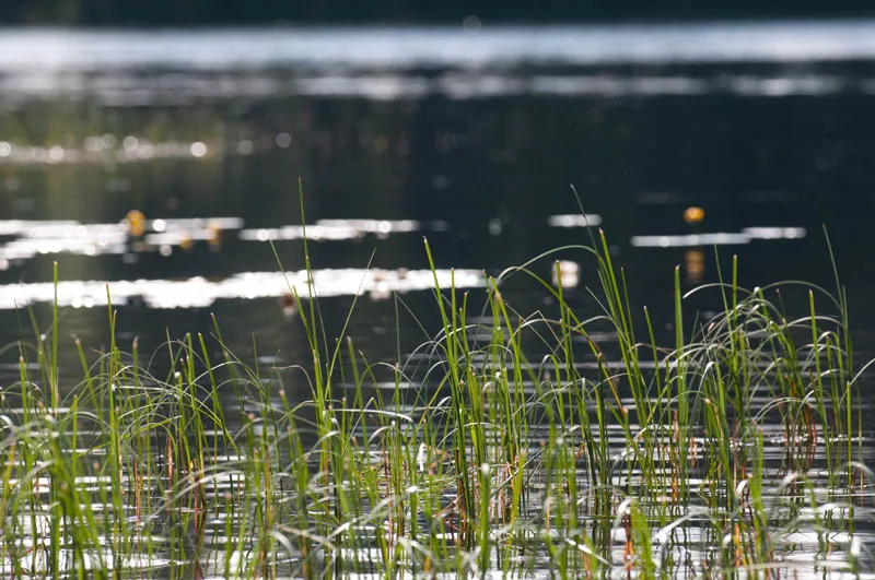 The reeds and water lilies near the bank of a lake