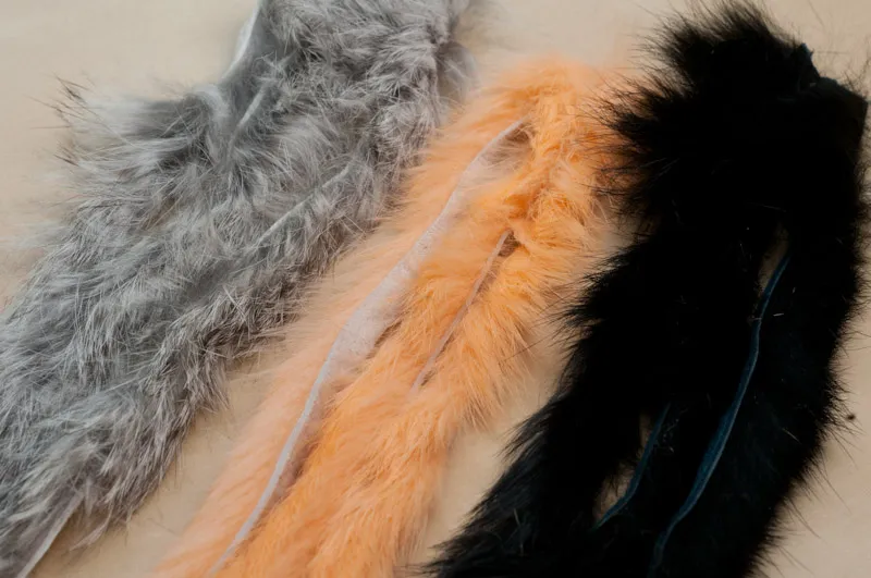 These rabbit strips are precut and packed three at a time. The left one is natural and has just been pulled out of the bag while the two right ones are dyed and have been soaked and dried hanging hair down