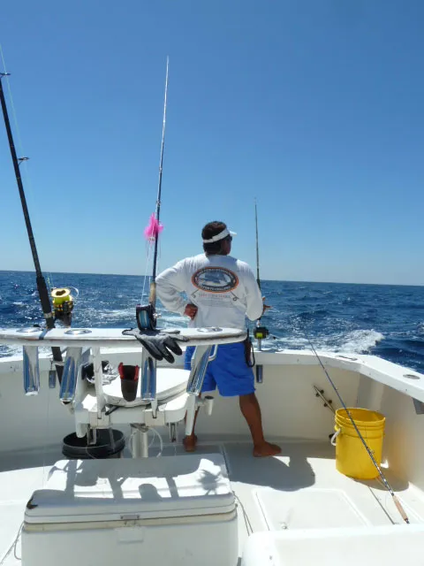 Port stern corner with bucket holding about 20 feet of fly line, fly rod at the ready, and fly resting on the gunnel ready for the angler to begin the casting sequence.