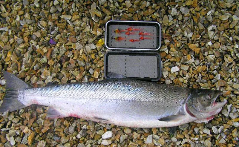 A nice salmon fell for a shrimp fly, and there are more of them in the box