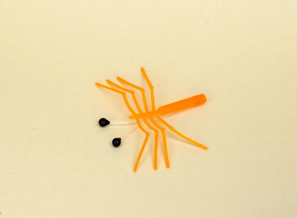 The eyes and the legs need a hook and maybe a bit of dubbing to make a decent shrimp. The protrusion to the right is the "handle", which is trimmed off the finished fly