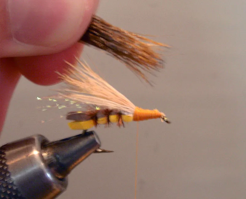 Select, brush and stack a small clump of dark deer or elk body hair for the bullet head. Here I have chosen brown for the golden stonefly pattern. To make sure your bullet head is the right size, measure it with the tips facing towards the front of the hook shank as shown. Your tie in point should leave the tips of the hair extending forward equal to the length of the overwing as shown above. Tie in at the start of the thorax, clip off the butt hair and wrap tightly forward