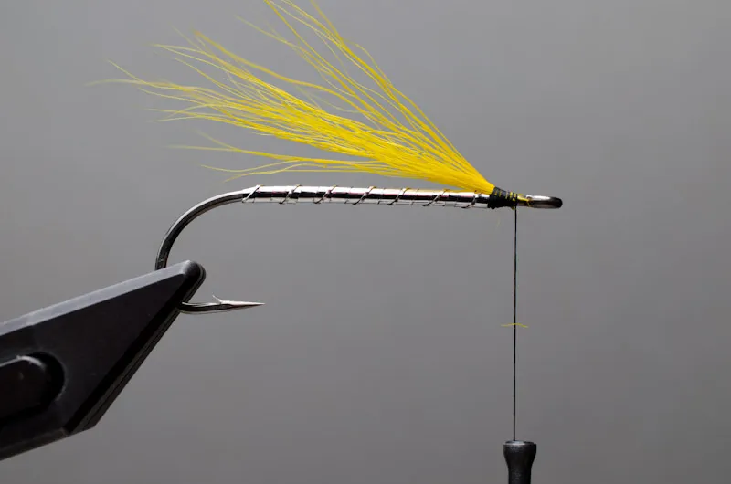Prepare a sparse bunch of yellow bucktail, trim it to length and tie it in