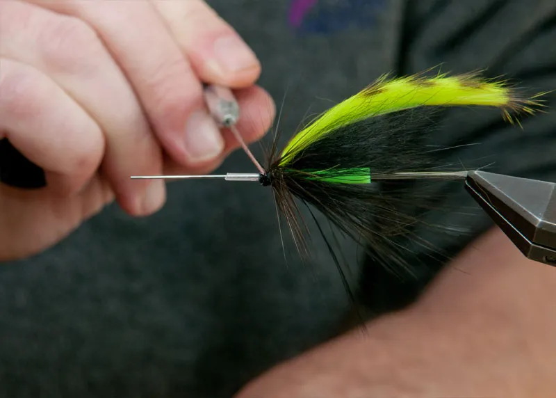 Add varnish or glue over the final wrap and the base of the hackle and wing