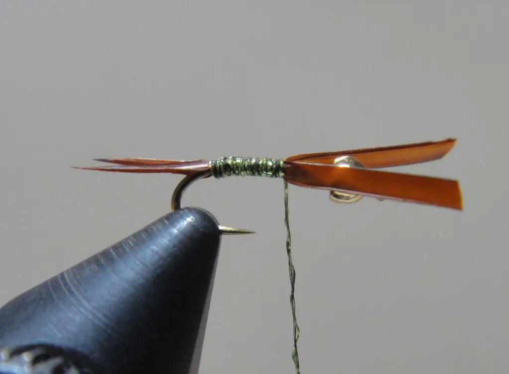 With touching thread wraps go over the excess biots until roughly one bead length behind the bead. This will create the body of the fly.