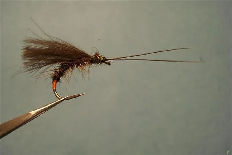 Tie in the antennae of either pheasant tail or elk hair. Form a head with the slightest of artificial peacock dubbing.