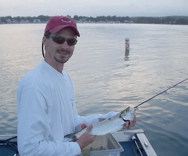 The author presents a hickory shad caught at sunset, a prime time for these fish.