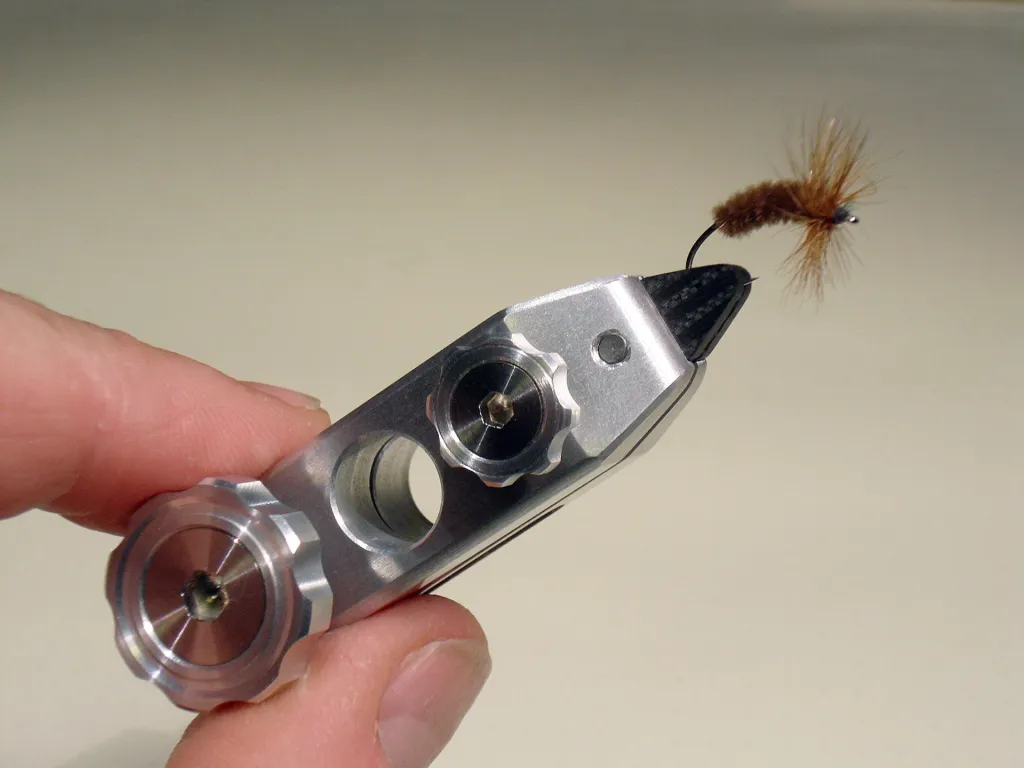 The removed tying head with the fly still in it, very useful gadget to work close by on the fly.