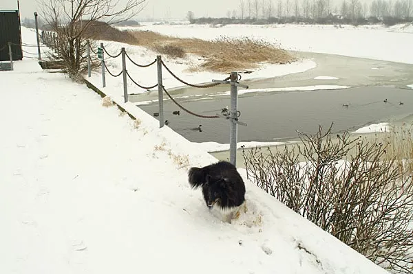 Divus on the sluice - doing what male dogs often do. Notice the bit of open water under the bridge. Birds gather here, and I'll bet that you can see fish here on good days. Just not today.