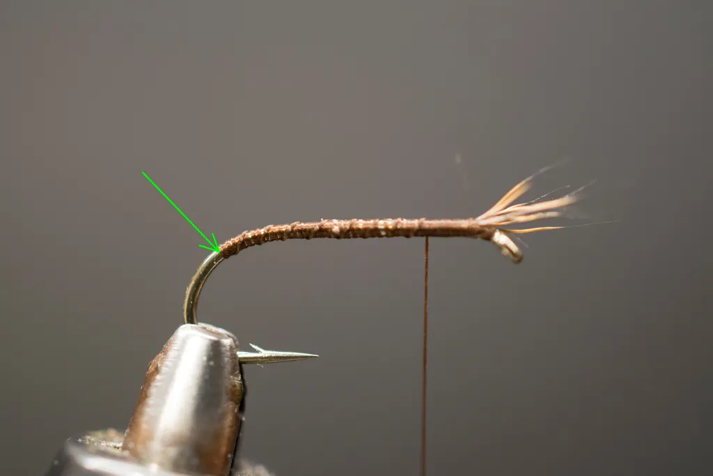 Start the thread, and tie in a few deer hairs to make feelers. Cover the hook shank with thread well into the bend.