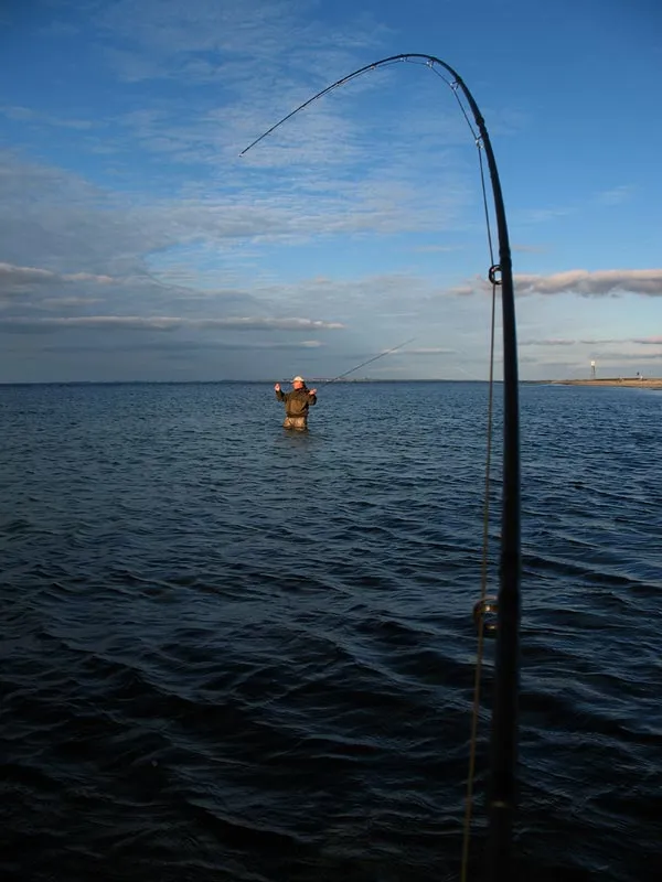 My rod with a fish on it frames Henning in the background