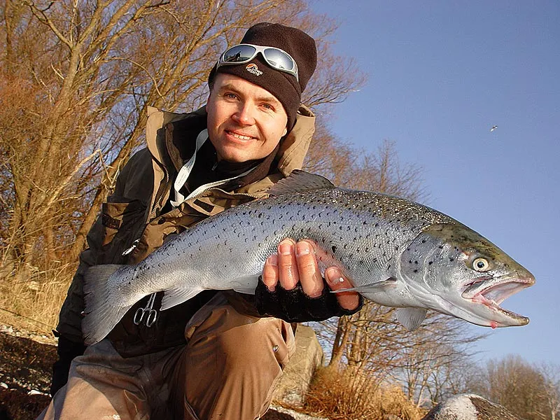 Kasper showing a prize winter fish. The sea trout, which don't spawn, but eat all winter will develop into extremely beautiful and healthy creatures.