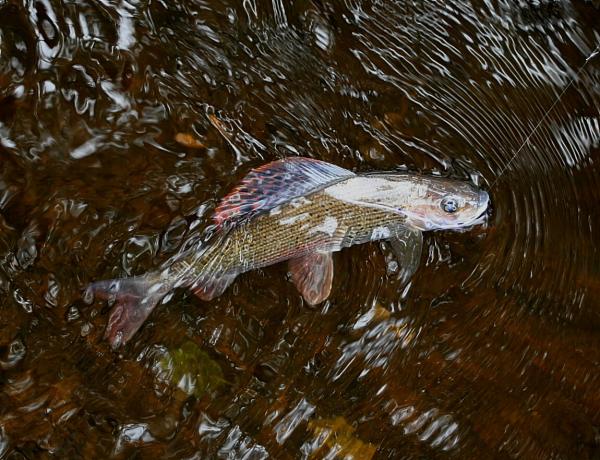 Grayling on pink Czech nymph. Nice colours of its body in the atumn.