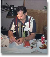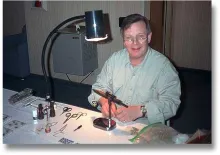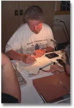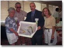 One of the most interesting items for sale at the Fundraising Auction, (which totalled some 23,000 dollars), was another one of Darwin Atkin's International Fly Plates, designed by Steve Jensen. The featured fly was a Jock Scott salmon fly tied by Judy Lehmberg, '97 Buszek Award recipient. Along with the featured fly were creations by Royce Dam, Kent Bulfinch, Stan Walters, Wayne Luallen, Andre Puyans, Giuseppe Re, Yann Bouglouan, Bas Verschoor, Reg Denny, Vic Bergman and Garth Coghill, with original artwork by David Ruimveld of Vicksburg, MI. The plate fetched $ 1,850.